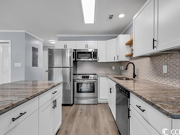 Welcome to this beautifully re-modeled 1 Bedroom, 1 Bath condo over looking nature in Fairway Village, Island Green, in Myrtle Beach, SC. This home would be a great primary residence, long term rental property or second home at the beach. Beautifully redone and updated, this home has new laminate flooring throughout, kitchen with all stainless steel appliances, new cabinets, decorative backsplash, granite countertops and over-sized island. HVAC was replaced in 2014 and hot water heater in 2016. Water and sewer, cable, and trash included in HOA. Square footage is approximate and not guaranteed. Buyers responsible for verification.