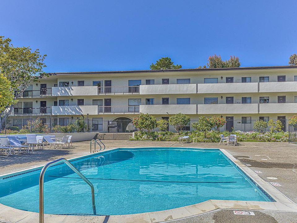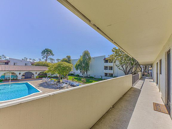 Bright and Spacious 2 bedroom 2 bath unit overlooking the pool and clubhouse! This 2nd floor condo is located in the highly desirable Monterey Sunbelt and nestled in a very quiet and private setting. Feel at home in the large primary bedroom with en suite bath, plus a spacious 2nd bedroom and full bath. There is a private patio with access from both bedrooms. The Ocean Forest Condominiums offers the serenity of a beautifully landscaped complex with access to an outdoor heated swimming pool, sauna, club house, barbecue area and laundry on site plus Immaculately kept grounds. Uniquely built from high density concrete offering extra quiet and privacy. Recently painted with new flooring this is a must see unit in a highly desirable complex. Plus, the HOA fee covers all basic utilities (water, electricity gas, sewer and garbage). One designated covered parking space is included, with additional parking for guests. Conveniently located near Monterey Peninsula College and downtown Monterey.