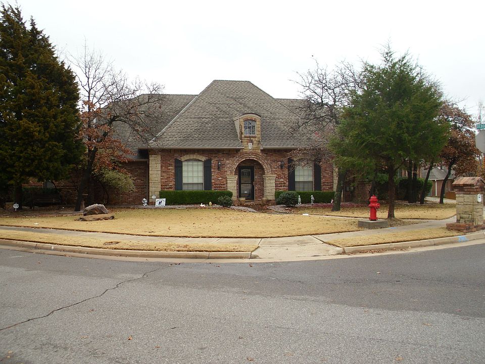 Beautiful corner lot with mature trees in Edmond's Fairway Estates next to Kicking Bird Golf Course. Back yard is secluded with a heated pool and waterfall. 2 covered patio areas to enjoy pool. 3 car garage has 3rd car pull through for back yard access. Garage also has in ground storm shelter with built in safe. Interior has been updated and remodeled with hardwood floors and granite counter tops all with fresh paint inside.