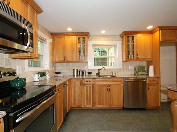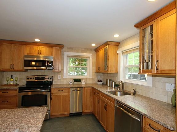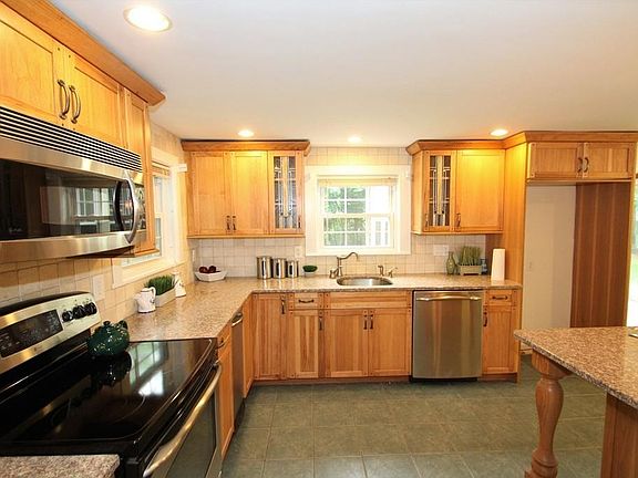 This fantastic cape is ready for you to call home. The updated kitchen features many upgrades and custom touches like stained glass door panels stone counter tops and pendant lighting. The color of the young architectural shingled roof complements the color of the recently installed vinyl siding. The house features pocket doors and a sun splashed den with cathedral ceilings and built in cabinetry. The level oversized fenced in private yard with custom patio is a great place to entertain your guests over the summer months. Refreshing central air is a wonderful touch during the hot summer months. Newer double pane tilt-in windows make for easy cleaning. The spacious front to back living room is a great place for formal entertaining. The full basement is a great place to watch a sporting event or movie on your big screen television. Other updates include circuit breakers and a large shed. As your guests pull in the driway they will notice the custom fencing with arched gated yard access