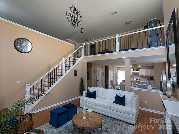 Stunning turnkey home that boasts a one of a kind wrap around loft that overlooks the lower level with iron spindles that flow down the wood staircase to the impeccable living room. Take in the earth tone colors and the thoughtful decor as it leads you into the dining area & kitchen. Upscale hardware; Storm doors, recessed lighting throughout. The 2nd level loft are excellent for entertaining, exercise; office; you choose. 2 Large bedrooms and a hall bath are highlighted by the huge loft. The sellers have added updated hardware throughout; including the kitchen; spindle stair railings; kitchen back splash; privacy fencing; shower in primary bath & lighting through out.