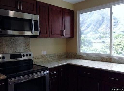 Beautiful end unit at the Esplanade. New central A/C to be installed on June 30, 2020. Located in Hawaii Kai along the Marina. The unit was remodeled approx 2 years ago. It has a great open kitchen with granite counters, new cabinets, stainless appliances & a great view. The living room is larger than most. There is carpet or tile throughout. The bathrooms, one in the master bedroom, there other near the 2nd bedroom are upgraded & sleek. Views are of the Marina & Koolau's. There are 2 assigned parking spaces and several guest parking stalls. Tennis courts & pool are available. It's close to bus stops and restaurants, stores. The esplanade is a very gracious place to live. There is a $22 application fee per adult. It's ready to rent now and very easy to see.
