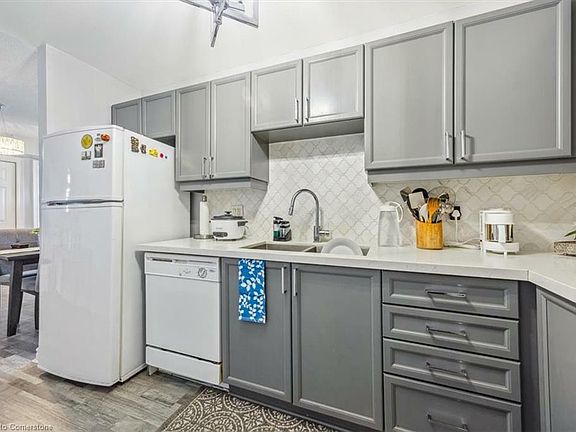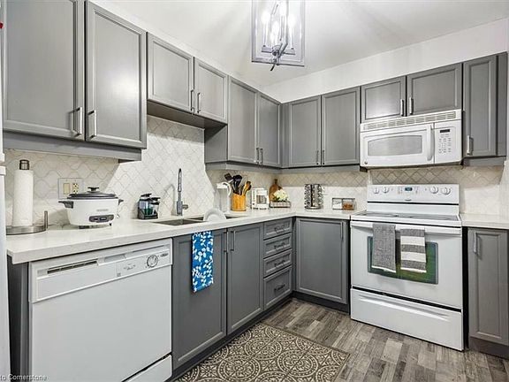 Renovated, Updated Laminate Flooring Throughout, Newly Painted, Quartz Counters and Faucets in both bathromms. Updated light fixtures in kitchen, living room and master bedroom. Stunning renovated kitchen with marble back-splash with updated sink, updated cabinets. Owned hot water tank. Suite comes with 2 parking spaces. Perfect location close to schools, shopping, highway.