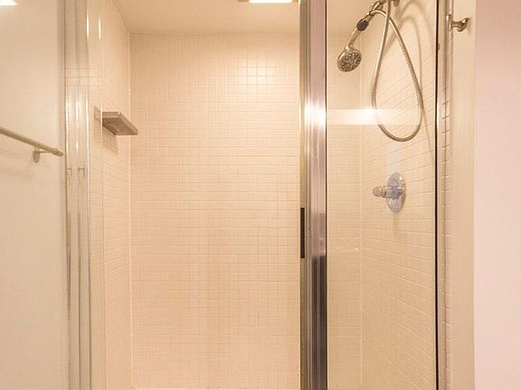 In this larger sized one bedroom, one bathroom apartment home, the living room and bedroom have slightly more square footage than the standard sized one bedroom apartment. Residents will enjoy an open floor plan with modern features throughout such as black and white appliances and chrome bathroom fixtures. All large-sized one bedroom apartments feature opaque sliding glass doors which separate the living room from the bedroom and sliding pocket doors that separate the kitchen from the living area. The full bathroom includes a stainless steel sink and countertop as well as a glass and tiled enclosed standing shower.