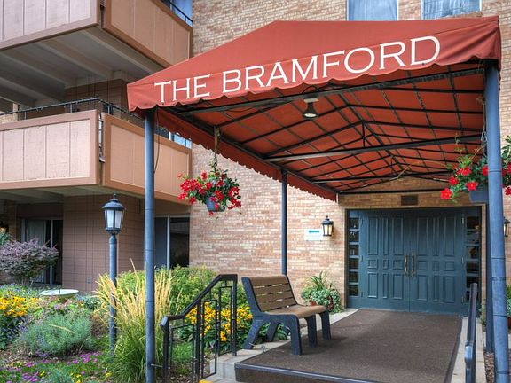 Move-in excellent condition in the coveted Bramford building. Upgraded kitchen with light Maple kitchen cabinets with spacious storage. Nice bright wood floors. Beautiful granite counter tops & island great for cooking while entertaining. Recessed lights & corner fireplace. Glass sliding doors with East facing covered porch for privacy & safety. Perfect for enjoying meals on sunny bright days. Great open floor plan. Available for showings beginning the following week.