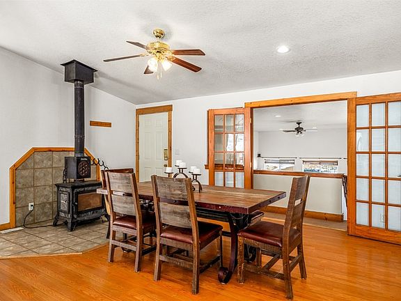 Discover this roomy and inviting home located on the outskirts of town, offering a perfect balance of comfort and the serene charm of nearby ranch land. This property boasts a cozy wood-burning fireplace in an oversized dining area, ideal for warm gatherings. The generously sized living area is filled with natural light and showcases stunning open views, creating a welcoming atmosphere. The spacious kitchen is equipped with stainless steel appliances, a large island, and ample space for entertaining guests. Step outside to find a generous, flat, and fully fenced lot with irrigation, making it perfect for pets, kids play, or gardening. An abundance of outbuildings, including a storage shed, chicken coop, and greenhouse, add to the property's versatility. Very private back deck with a hot tub pad provide for the perfect outdoor living setup. Gardening beds are included for those with a green thumb. For outdoor enthusiasts, the standout feature is a sumptuous three-car shop/garage, fully finished with epoxy flooring, a floor drain, and a convenient half bath. Additional features include an on-demand water heater, a jet water pressure pump, and a newer roof with ice and water shield for added durability. This home offers the perfect mix of rural charm and modern convenience. Don't miss the opportunity to make it your own!