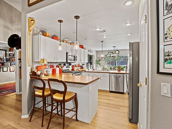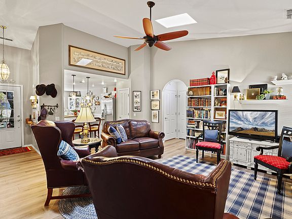 Beautifully updated home on a corner lot in the popular subdivision of Woodhill! This 3 bedroom, 2 bathroom home features 1,451 sq. ft., a 2 car garage with built-in cabinets, LVP flooring throughout, and beautiful landscaping. The living room has vaulted ceilings, skylights, and a fireplace with an electric insert surrounded by wood shiplap. The kitchen has plenty of counter space, a pantry, newer stainless-steel appliances, and a large breakfast bar. The master suite features private access to the covered patio, a walk-in closet, double sinks, a garden tub, a walk-in shower, and a private toilet room. The back and front yard have covered patios. Outside nestled in the mature trees is a perfect spot to enjoy the amazing details to this beautiful landscaped yard.