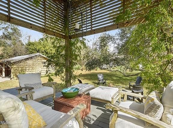 Beautifully appointed home with majestic live oaks on a large corner lot and just a short stroll to the sandy beach. This home has spacious bedrooms, great natural light throughout, incredible porches for entertaining, stunning hickory floors, gourmet kitchen with gas range, 11.5' high ceilings, wood burning fireplace, large first floor master suite, custom tile work, sold wood doors with transoms, beaded board wainscoting, surround sound, fire pit, fenced yard, carport. Beautifully painted and extremely private, this home is a must see!!