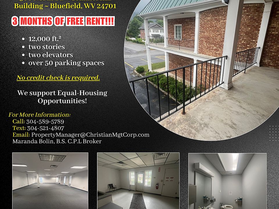 500 North St. ~ Commercial Building ~ Bluefield, WV 24701 3 MONTHS OF FREE RENT $3,500 to lease the whole building Or $1,750 to lease the top or bottom half of the building Large commercial space for lease in the old Blades Clinic building in Bluefield, WV! Over 12,000 ft. if you lease the entire building. Two stories. Bottom level or top level of 6000 ft. can be rented for half the monthly price. Numerous offices, conference rooms, his & her bathrooms, waiting areas, two elevators, over 50 parking spaces, 1.2 acres, located on a corner lot, too many features to list. No credit check is required. Security deposit can be made in two payments. You will be allowed to remodel to suite depending on what business you will be conducting out of the building. Showings by appointment only. All utilities are on in the building currently. Move-in ready today! Christian Management Corporation Office Hours: Mon-Fri 9:00AM-5:00PM & 10:00AM-2:00PM the 1st Saturday of every month We support Equal-Housing Opportunities!