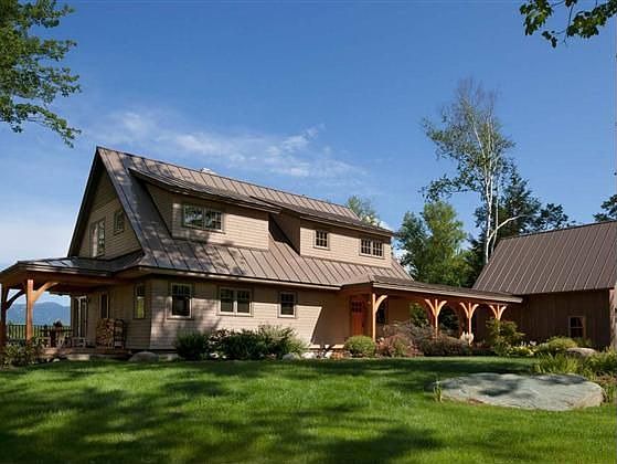 Perched on a wooded hillside this 2010 architect-designed Adirondack style home represents the best in local design and craftsmanship. Views are expansive, northwest toward Mansfield, Spruce and Trapps, and eastward to the Worcester Range. The 5 acre former sugar bush property is serene, private, yet only moments from town. The sloped setting features perennial gardens and terraced landscaping leading to a pond and raised-bed vegetable garden. Constructed primarily from local materials, the 4 bedroom, 3 1/2 bath interior features high timber-framed ceilings, radiant heating throughout, custom cabinetry and bookshelves. The kitchen has top quality appliances, a spacious windowed pantry, and a built-in breakfast nook that takes advantage of the morning sunlight and Worcester views. A granite hearth is the centerpiece of the open living area. Even the walkout level is exceptional, with 9 1/2' ceilings and full Mansfield views.