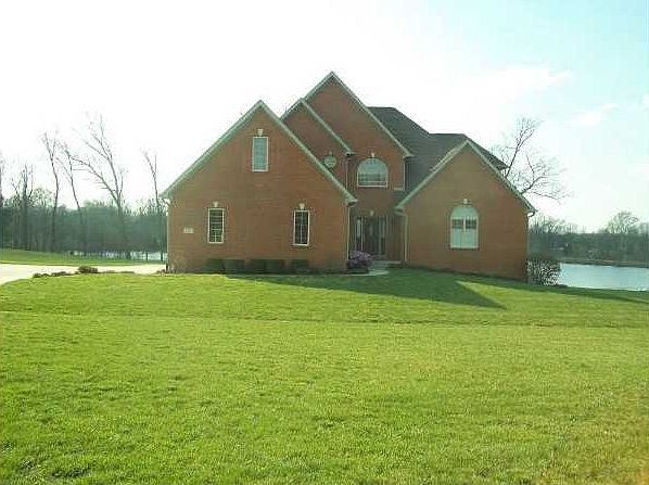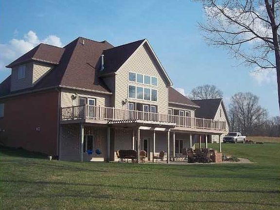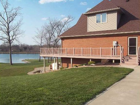 5100 sq ft custom brick home on 4.28 acres with 110' of private, community lake-your own boat dock, fire pit, paver patio (w pergola & grill). 3-car detached brick garage is (in addition to 2-car attached) oversized, heated & has storage above. Main-level master walks out to 53' Rhino deck. 2-story great room w/ fireplace & wall of windows for awesome views of lake. 2 custom kitchens (all appliances), 3 laundry rooms. Finshed, walk-out lower level w/ home theatre, bedroom, bath and 2nd kitchen