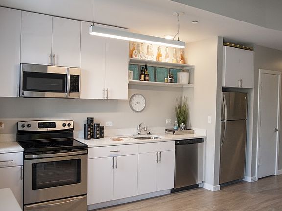 - Contemporary white cabinetry with modern finishes and quartz countertops