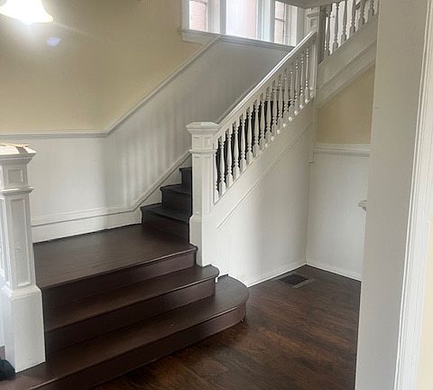 Three story, 6 bedroom home with two and half baths, one full bath and kitchen on second floors. One year renewable lease includes water/sewer garbage, gas and lawn care. Across from Do-it-Best Hardware, Close to park. Ample street parking.