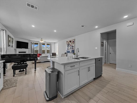 Open floor planLiving and dining areasPlenty of natural lightCovered patioModern kitchenPrivate home theaterLarge media room