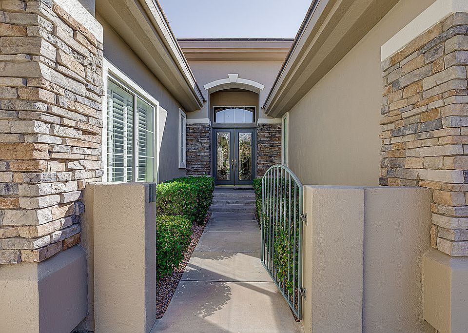 Enter through guard gate into the prestigious Summerlin community of Eagle Rock. Amazingly maintained single story home surrounded by golf courses, entertainment, dining, shopping, and much more. This 4 bedroom home boasts room for all, plantations shutters, custom paint, detail abounds! Family room in front is spacious and overlooks beautiful backyard. Enjoy the formal dining room with custom Swarovski crystal chandelier, transitioning into kitchen. Dream kitchen boasts oversized granite island with matching granite countertops, newer appliances, double gas ovens, gas cooktop, RO system. Living room has custom cutouts, gas fireplace, ceiling fan and additional dining area. Primary bedroom is large with access to backyard. Primary bathroom has large tub, separate shower, double sinks, and walk in closet with built ins. Laundry room feature cabinets, and sink. Secondary bedrooms all have carpet and ceiling fans. Covered patio overlooks sparkling swimming pool with water features & spa.