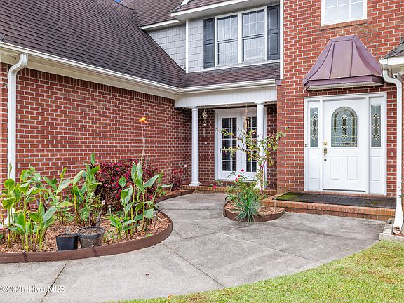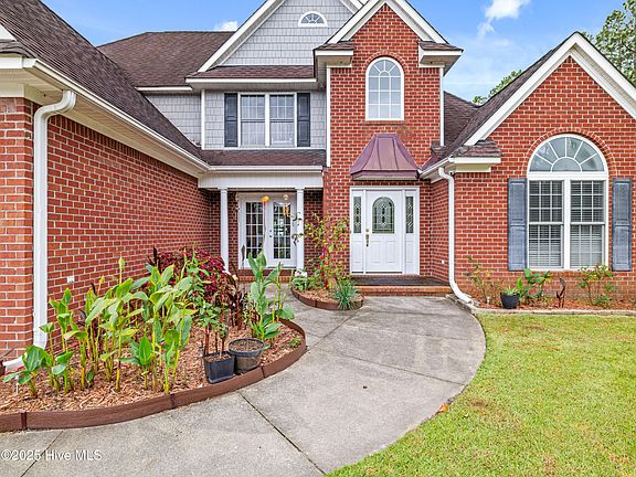 Oh yes, This home has it all! From the stunning roof peaks, the curb appeal, and brick exterior, to the vaulted ceilings in the living room with a catwalk balcony- there is SO much to discover about this home! Almost 3,000 sqft of wonderful living space - a home office, formal dining room, gorgeous and bright kitchen with stainless steel appliances, and your primary suite is on the first floor, too! Featuring trey ceilings, a LARGE walk-in closet, plus You'll enjoy relaxing in the en suite primary bath jacuzzi, unwinding and soaking it all in. (A second bedroom and full bathroom is downstairs, as well!) Upstairs, you have the additional 2 bedrooms, another full bathroom AND a bonus room- perfect for a home theater, craft or game room! You won't be lacking space with this new home. The layout is so convenient, and you have a laundry chute! You will fall in love. There is also an extended driveway for more parking space! Curl up with a book in your gorgeous enclosed sunroom, OR entertain on the uncovered patio space in the backyard. Rain or shine, you can enjoy our North Carolina weather all year long. Outside, you have a large vinyl fenced in backyard, with raised flower garden beds for those with a green thumb. Recent upgrades include a newly installed HVAC and water heater in 2024 which gives you peace of mind! As if that's not enough, the home is located just 5 minutes from MCAS Cherry Point gate, 25 minutes to New Bern, and 30 minutes to Atlantic Beach. This one is a must-see, so call your favorite realtor and book your showing today!