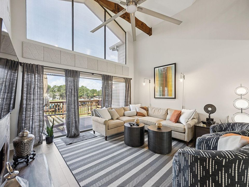 Waterfront condoWood-burning fireplacePrivate retreatSoaring two-story floor-to-ceiling windowsStainless steel appliancesStorage roomQuartz countertops