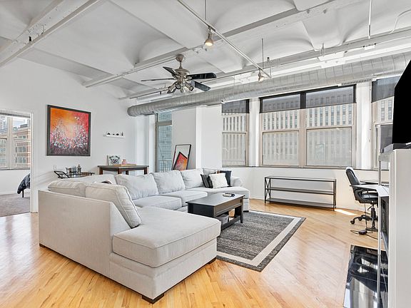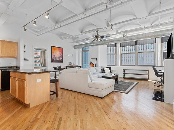 Bright and sunny corner loft condo with split bedrooms, 11 foot barrel vault ceilings, balcony for outdoor enjoyment, fireplace, extensive hardwood floors, kitchen with granite counters and extensive cabinets plus island, large walk in closet plus in-unit washer and dryer, and extra storage cage. Lots of storage and such a great location. Deeded outdoor gated assigned parking spot included. Door person, workout room, bike room and exceptional location with easy access to Eisenhower, Kennedy, and Dan Ryan. Close to the Loop, shopping, transportation, Millenium Park, theaters, and all the dining places that you want to go to. Historic 1887 Western Electric building converted in 2001. Deeded parking space U114. You will love it!