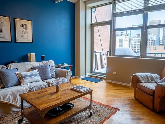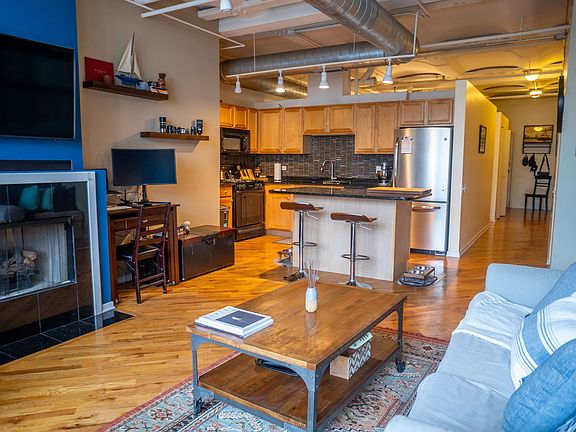 City Living at its Finest! This highly upgraded and renovated 1 bedroom in popular Clinton Complex! Unit features renovated kitchen with custom cabinets, granite counters, beautiful back-splash and large island for entertaining. Large living room with gas fireplace. Hardwood floors. Stone bathroom with soaking tub. Custom lighting and paint. 10 foot ceilings. Brand new custom sliding door ($6,000) Balcony with North views of Chicago skyline. Building features fitness center, 24 hour door-person and on site management. Pet friendly. Garage parking included in the price.