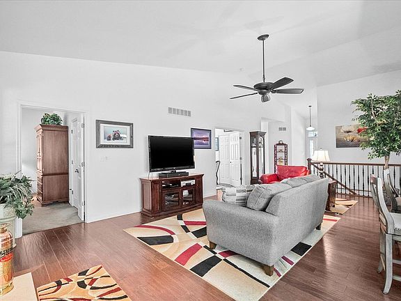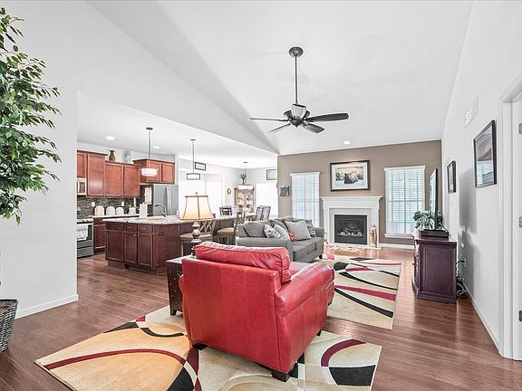 Upscale living at its finest! Custom designed villa 4 bed 3 full baths. Entry foyer greets you with beautiful real hardwood floors. The heart of the home is the spacious open floor plan Great Room with cathedral ceilings, gas fireplace, designer ceiling fan, and tons of natural light. WOW kitchen will knock your socks off! Custom granite island 96x68.5 perfect for entertaining. Island has double sink + dishwasher, cabinets are 42" custom with pull out shelving even the ends of the island, walk-in pantry, gas stove. Mainfloor laundry with custom shelving also. Floorplan redesigned to have Dining Room with bay window and walk-out to custom covered patio. Unwind in beautiful Primary Suite and Bath with coffered ceiling. Huge double bowl vanity and spacious shower and yes linen closet + walk in closet. There are 2 more bedrooms + 1 full bath on main level. The finished lower level has 4th bed room & 3rd full bath, huge Rec Room w/custom counter/bar. Plus insulated 3 garage & doors. Location: Detached, Ground Level, Suburban