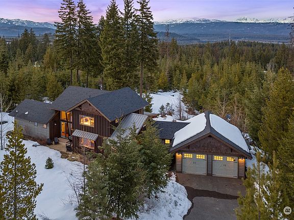 Escape to Trailside at Woods & Steele, a planned mountain community w/gated entry, Lodge w/swimming pool/hot-tub/game-room & trail systems. Originally the builder/developer home, this stunning NW artisan-style retreat w/all the upgrades sits on a premium 2.2 acre lot. Unique features include exposed beams & trusses, soaring ceilings, creative open staircase & floor-to-ceiling windows that capture extraordinary Stuart Mtn views. Spacious kitchen w/gathering island has new quartz & granite countertops & RH light fixtures. Primary suite on main; guest, bunkroom w/barn doors & shhh...a secret room on upper level! Double doors off dining lead to outdoor patio w/heater & new chandelier, 2nd private patio at back. Large landscaped yard w/firepit.