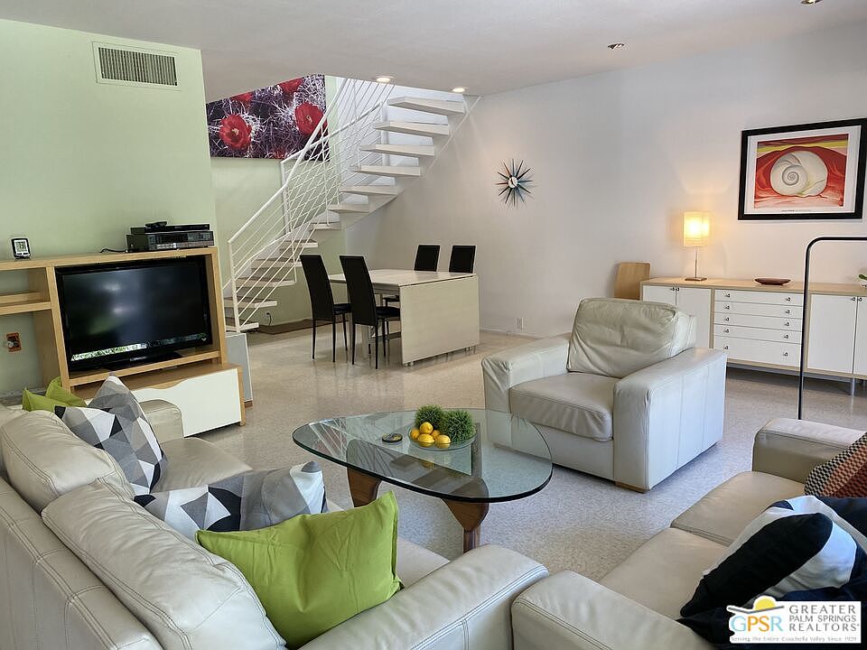 Step into the heart of Palm Springs' architectural renaissance with this stunning mid-century gem. Designed by visionary Herbert W. Burns, a pioneer of the Desert Modernism movement, this architectural masterpiece is a testament to the city's rich history. Fabulous Mid-Century Architecture: Embrace the timeless elegance of mid-century design with clean lines and striking accents that define this remarkable property. Wake up to breathtaking views of the majestic mountains every day, right from your own balcony. Amazing Downtown Location: Located just a block and a half from the vibrant downtown area, you'll be at the heart of the action, with great restaurants, shopping, casinos, and outdoor activities right at your doorstep. Resort-Style Living: Dive into the refreshing pool and relax in the spa, just steps away from your front door. Property Details: This unique condo offers a two-level townhouse style layout with two spacious bedrooms and two baths on the upper level, accessible via a mod spiral staircase. The main level features a generous living and dining area, perfect for entertaining, along with a convenient powder room. The kitchen is both spacious and functional, offering ample storage for all your culinary needs. Step outside to your private downstairs patio for a more secluded escape or head up to the balcony to soak in the stunning views of the mountains and pool area. The roof and skylights are new as of December 2023. This unit is being offered furnished, so you can move in and start enjoying the Palm Springs lifestyle immediately. Named after the historic "The Tennis Club Resort," this neighborhood is steeped in Palm Springs history, and you'll be part of it! This is your chance to own a piece of architectural history and be a part of the ongoing preservation revolution that has made Palm Springs a global architectural icon. Experience true Palm Springs living at 500 W. Arenas - where mid-century dreams become reality!