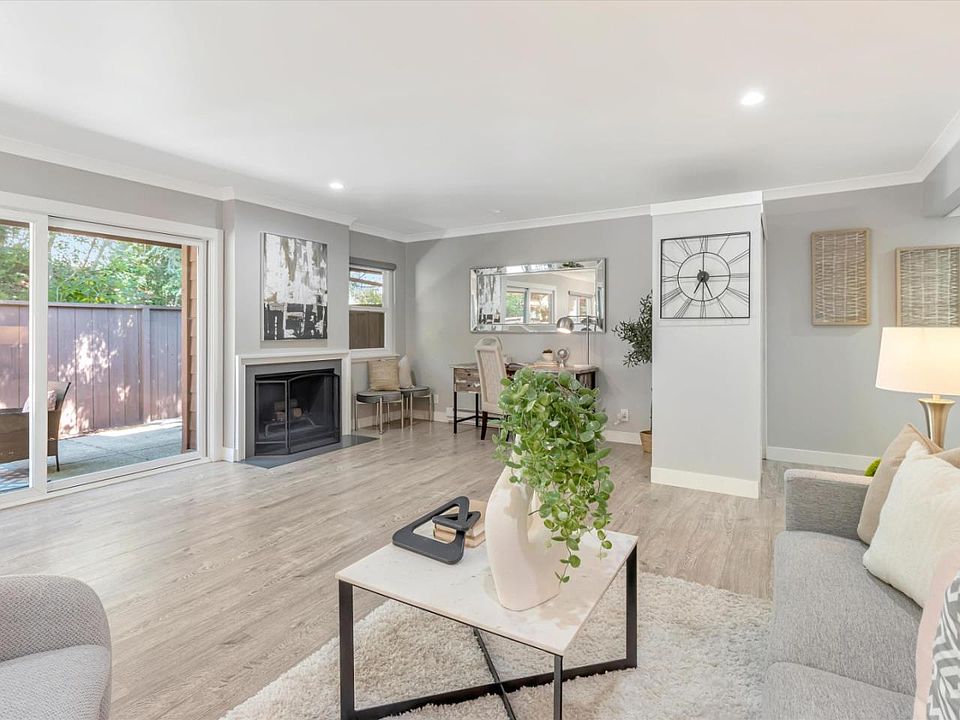 Welcome to this updated single-story townhome-style condo in highly sought-after Willow Park, with no neighbors above or below you. This spacious, freshly painted, 740 sq. ft. condo has a large private backyard, with no neighbors behind you, and a patio that is surrounded by gorgeous redwood trees. The large open living room has a wood burning fireplace, an office/play area, and a sitting/gathering area. Kitchen features quartz countertops, stainless-steel appliances, and skylight. Bathroom has a shower above tub with a glass enclosure, new exhaust fan, and tile floor. Generously sized bedroom has wall-to-wall closet and a laundry closet with full-sized stackable washer/dryer. Additional upgrades include laminate floors, recessed lights, new dual-paned windows/double sliding glass door, new permitted electrical panel, new closet doors in the entry way and hallway, new chandelier, and insulation in the attic. Complex amenities include pool, clubhouse, and EV Charging Stations. Just blocks to downtown Mountain View, with Farmer's Market, shops, restaurants, CalTrain, and Light Rail. Easy access to major employers, Stevens Creek Trail, and highways 85, 237,101. Twilight Open House on Friday, 4/7, from 4:30 - 6:30pm. Open Houses Saturday, 4/8, and Sunday, 4/9, from 1:30 - 4:30pm.