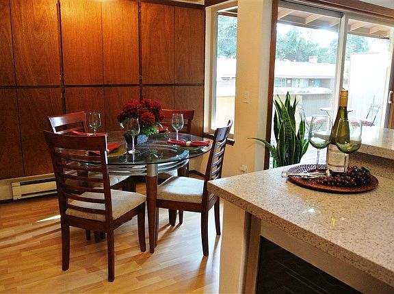 Beautifully updated end unit in peaceful complex. No one above or below. New quartz counters throughout, new SS appliances including wine fridge, new tile & fixtures in hall bath. Very open and light w/ dual-pane sliders & windows, numerous skylights, large deck. Lots of closet space + extra storage unit. Exc location! Near Castro St, Stevens Creek Trail, Caltrain, Light Rail, Hwys 85/101/237.
