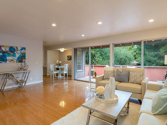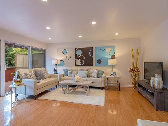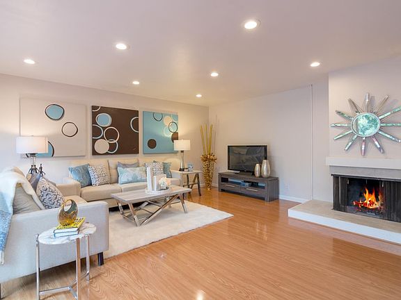 Updated single level second floor end-unit w/ no one above or in desirable Willow Park. Formal entry. Generous sized living room w/ laminate flooring, recessed light, wood burning fireplace w/ new tile surround & wall of floor to ceiling windows w/ 2 glass sliders that open to the sunny balcony. Separate eating area. Updated kitchen features quartz counters, wood cabinets & stainless steel appliances including a microwave, oven, dishwasher & refrigerator plus recessed lighting & a skylight. Master bedroom has a wall of closets w/ mirrored doors, ceiling fan & laminate flooring. Updated master bath features a separate dressing area w/ a white shaker style vanity & granite countertop, plus a stall shower, glass door enclosure & tile flooring. Spacious second bedroom w/ wall to wall closets & mirrored doors. Second full bath features a wood vanity, custom mirror, shower over tub w/ tile surround, glass door enclosure & tile flooring. Community laundry. Ideal location near downtown MV.