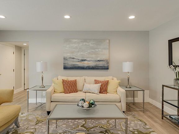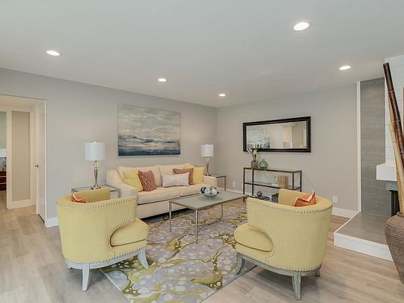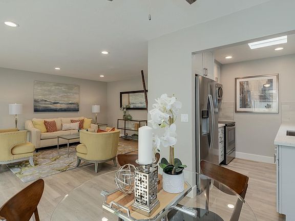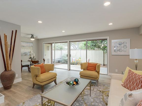 Beautifully remodeled single level townhome with no one above or below. Modern and fresh - every interior surface has been upgraded. Light filled kitchen with skylight has new cabinetry, quartz countertops, stainless steel appliances and subway backsplash. Living room features wood burning fireplace and expansive glass doors overlooking private patio. Recessed lighting, wood-look laminate flooring, wide 5 inch baseboards and new electric baseboard heaters throughout. The spacious bedroom has wall-to-wall mirrored closet providing abundant closet space. Elegant bath with new vanity, quartz countertop, stylish tile tub surround and rain shower head. Complex amenities include pool, clubhouse, laundry facilities and assigned parking. Great location just minutes from downtown Mountain View with easy access to parks, groceries, dining, public transportation and all of Silicon Valley in just minutes.