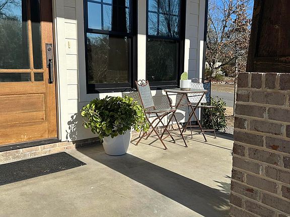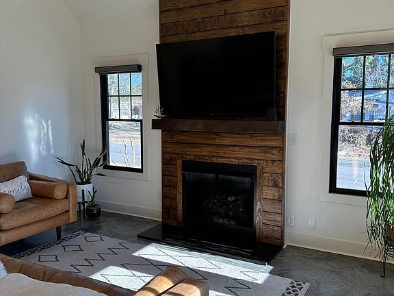 Customized singe-level cottage on a corner lot. Open floor plan with vaulted ceilings throughout. Lots of light through its many windows with maximum privacy at the same time. Windows are tinted to allow clear view from inside out and mirrored view from outside in. Custom shades provide aesthetics and added privacy. Interior has a modern flair with its polished concrete floors in all areas except premium tiled bath and laundry room flooring. Upgrades include: brick chimney; brick pedestals with stained wood tapered columns; black windows and gutters; ice/water shield in roof valleys and around gutter line; quartz countertops in kitchen and baths and leathered granite around deep sink in laundry room with drying rod above it; cabinetry above w/d; tiled wall surround in guest bath tub/shower; shiplap fireplace surround with mantle; high-end KitchenAid appliances (gas range, refrigerator, and dishwasher); hammered copper farm sink; upgraded faucets; ceiling fan upgrade in LR and MBR; wood shelving in pantry, master bath linen closet, and built-in in LR; river rock shower base in Master bath and frameless shower door; large LED mirror in Master bath with unique lighting above; square sinks in both vanities; custom California-style closet in MBR; pocket door in Master bath; barn door for MBR closet; extra electrical outlets; doggy door; concrete patio with pergola; fencing.