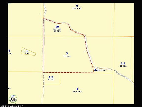 Welcome to Westbrook Creek Farm! This unique, pristine property is located in the Eureka Community on the corner of Westbrook Road and James Crouch Road. With manicured fields, food plots, and beautiful hardwoods, it's an ideal horse or cattle farm with fantastic deer and turkey hunting, too. We saw turkeys while on the property, and there are deer signs everywhere. A beautiful creek runs right through, and there's also a small pond, adding appeal for the wildlife and an opportunity for future fishing. Original barbed-wire fencing surrounds the property, but would need repair for livestock, and there's a picturesque barn for your horses. TVEPA is the electricity provider, and fiber optic internet is available through TVI-Fiber. Community water is available in the area through the Lovejoy Water Association. Garbage pickup is with the Panola County Solid Waste. All of this tract is located south of James Crouch Road (see map in photos.). This property contains all of parcel #122203000000001000 and 53 acres of parcel #122210000000000300 (The original parcel was split, and this tract has all of that acreage that's on the south side of of James Crouch Road. Some parcel maps are still showing an outdated map.)