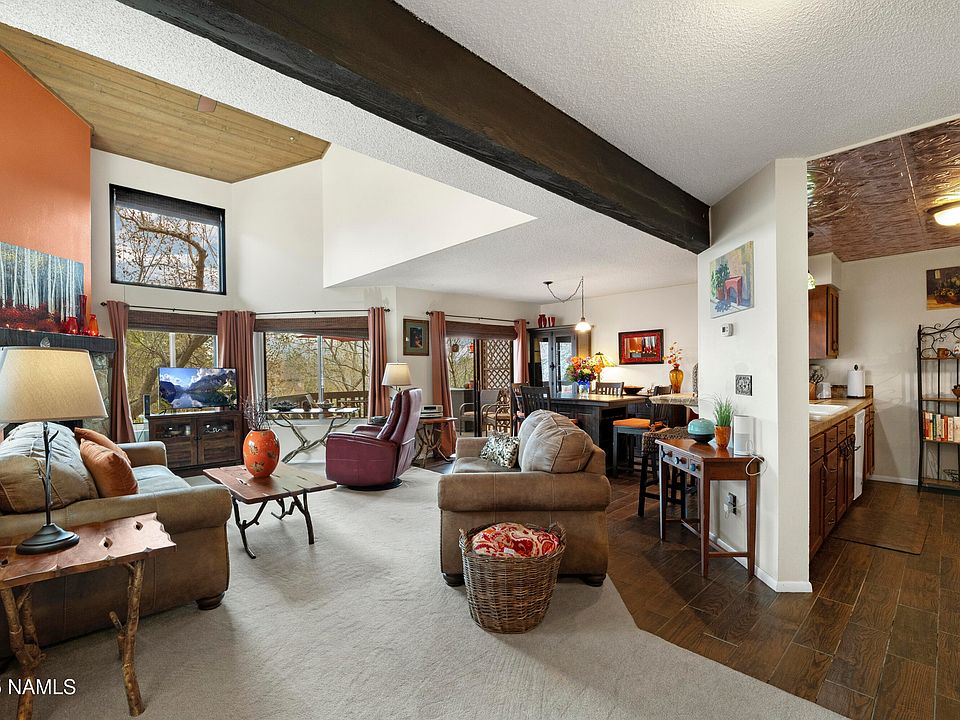 Looking for a relaxing home just a short distance from Continental Country Club amenities- including clubhouse, golf, restaurant, pool, fitness center, tennis, and pickleball?? After a day of play in this active community, come home to your dream retreat in the desirable Saddleback Lodge development. This charming three-level townhome blends modern upgrades with cozy comfort. As you step through the entry door, you're greeted by a bright and inviting Saltillo tiled foyer, setting the tone for the warmth and charm that awaits. Ascend the stairs to discover a spacious living area adorned with a stunning gas fireplace and crowned with a high wood-paneled ceilinga perfect invitation for intimate gatherings. The open floor plan effortlessly connects the living space to the dining area and kitchen, where you'll find refaced cabinets, new appliances, and upgraded countertops. Venture upstairs to uncover two luxurious bedrooms, each boasting ample closet storage to accommodate your every need. The oversized guest bedroom offers its own hall bathroom, ensuring ultimate privacy and relaxation for your guests. Meanwhile, the primary bedroom awaits as a serene oasis, complete with dressing area and ceramic tiled bathroom with tub. The delights extend beyond the interior. Step outside onto your east-facing covered deck and immerse yourself in calm. Whether you're enjoying your morning coffee to the soothing rustle of mature trees or sipping a glass of wine under the pink glow of Elden Mountain at sunset, this outdoor sanctuary beckons for relaxation and rejuvenation. With its thoughtful design, modern upgrades, and unbeatable location (walking distance to Oakmont Restaurant, and Continental Country Club, where you can enjoy all of the properties amenities with your yearly HOA fee), this inviting townhouse is sure to delight. Experience the perfect fusion of sophistication and comfort in your new home sweet home. Additional features include huge garage, new windows, breakfast bar, powder room, laundry room, and central A/C. *** HOA replaced deck handrail/railings October 2024 *** HOA to replace roof Summer 2025. *** Property has A/C