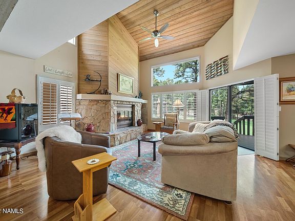 Upgraded end unit privately located at the back of the subdivision overlooking the 3rd green. This home features updated flooring, stainless steel kitchen appliances plantation shutters updated ceiling fans and light fixtures, stunning rock fireplace and an oversize two tiered deck with barbecue gas hook up. Upstairs you will find two large bedrooms along with two full updated bathrooms plus a large loft. Park inside your 2 car garage for the evening and enjoy wine on the large deck with beautiful views of the golf course and Mt Elden. This may be the nicest Saddleback Townhome in the subdivision. *Furniture and rugs included in sale