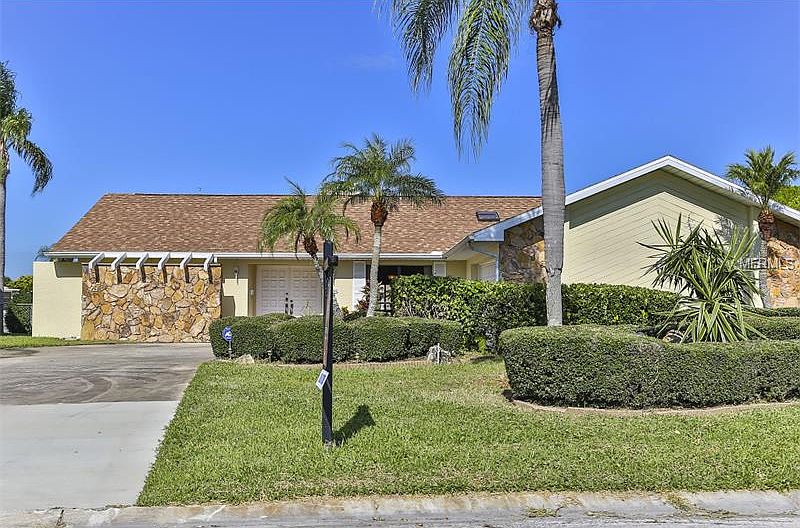 Location! Style! Comfort! This waterfront 1828 sf. pool home has it all. Imagine sparkling water views, easy gulf access & a warm, friendly living space to enjoy the waterfront lifestyle. The high-end, eat-in-kitchen is a WOW - with breakfast bar, upgraded stainless steel appliances, awesome granite counter tops & more, you'll love entertaining family and friends in this home. Kitchen is open to the great room, featuring a wood burning fireplace, high vaulted ceilings with beautiful wood beams & natural stone floors. Elegant wood framed doors & closets give this home a warm, class feel. The formal dining room is perfect for gathering meal, fresh caught fish perhaps? A desirable split bedroom plan has 3 bedrooms & 2 baths, a spacious master suite with sliders to the pool and waterside, his & her cedar-lined closets; the master bedroom features double sinks, a sunken shower & a sliding glass door opening into a private lanai area. You will enjoy plenty of outdoor living space around the pool, in the screened lanai. There is a floating dock & plenty of room for house kayaks/canoes/jet skis. The inside laundry room means more storage space in the 2 car garage with work bench area. If you're looking for a 2nd home or want to put on layaway for the future, this is a turn-key investment for month to month rentals. In fact, home has recently been leased for the winter months. Perfectly situated near the Gulf & the Gulf Harbors Beach Club, membership is only $144.00 year. The only thing missing is you.