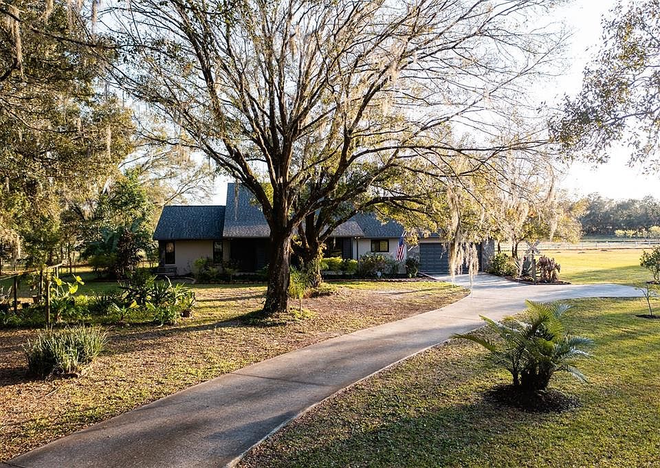 You will not want to leave the tranquil setting this property offers. This home is nestled on a gorgeous 2.1 acre piece of property with a tree covered winding drive. As you approach there is an inviting covered front porch that leads you to the double leaded double front doors. Enter into the foyer and you will see the stairway to the 2 spacious bedrooms and a totally remodeled bathroom with stone and tile. A pocket door is there to ensure total privacy for both upstairs and downstairs. The master suite is on the main floor and has room for all of your furniture and then some. There is also a 1/2 bath for your guest on the first floor as well. The kitchen is the heart of both dining area and open to both. The living room boasts an entire stone wall with a cozy wood burning fireplace and French doors to the covered back porch where you will LOVE relaxing while looking out over the property. The house has brand new premium luxury laminate flooring and all new paint inside and out. AC (2 units) are 3 yrs old as well as the roof. Water heater is 2 yrs old. The water system is 1 yr old and the hurricane windows were installed in April of 2022. The more than spacious garage of 836 sq ft is the size of a 4 car garage but it's deep rather than wide that also could be an amazing work shop, craft area or just get creative along with upper storage as well. It is obvious to the eye that this home has been loved. Easy access to the interstate for any commute. Just north of I-4 being 15 minutes to Plant City, 30 mins to Lakeland, Brandon or Z'Hills. Tampa and Orlando are both a straight shot . You couldn't ask for a better location or property