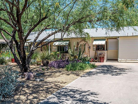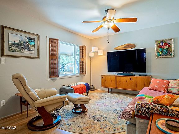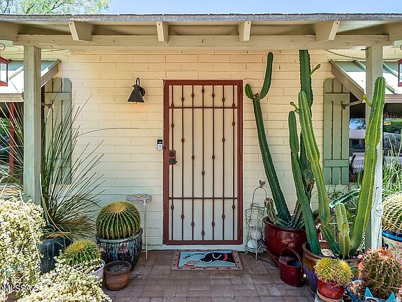One of a kind private oasis in the heart of Tucson. Beautifully landscaped front yard w/mature, arborist maintained trees & desert plantings. Open yet cozy split floor plan w/hardwood & tile throughout. Updated kitchen fit for a chef! Upscale appliances, solid hickory cabinets, Corian countertops, plus breakfast bar. Separate dining area & open flex space off kitchen great for an office. Newer exterior doors & windows, 4 w/rolling shutters on remote. HVAC 2018, tankless water heater. Primary bedroom boasts literal walk-in closet w/overhead storage loft. Covered patio designed for gatherings includes gas fireplace. Lush & private rear yard, guttered roof w/passive water system to plants, three sturdy sheds - one even has power. I dare you to find a nicer property at this price!