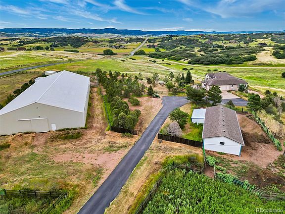 ** 35-Acre Horse Property Nestled in the Foothills with Sweeping Views in All Directions ** This single level home with a walk-out basement has 5 Bedrooms & 4 Bathrooms and is minutes from Sedalia, Santa Fe and I-25 ** The property sits atop a hill, up a paved private road, with a gated driveway, and includes a 10,000 sq ft Arena equipped with stalls, hay storage, and tack room, a Pole Barn, Corral/Round Pen and both a 3-Car and 2-Car attached garage ** Enter through a custom front door and into the great room space - with vaulted ceilings, hardwood floors and views to the South ** The fireplace wall is a focal point for the combined living and dining spaces, and a door leads out to the Sun Room which offers stunning views ** Step through to the Kitchen featuring ample storage & prep space and abundant natural light ** There is a breakfast nook and an adjacent pantry, with access to the laundry room and 3-car garage close by ** Double doors off the Living Room lead to a flex space with access to the front courtyard, perfect as a den or office ** The hallway leads to the Primary Suite, as well as 2 additional bedrooms and a full bath ** In the basement is a Family Room, access to the 2-car garage, and a 2 Bedroom Apartment, ideal for multigenerational living ** The apartment has a separate exterior entrance, complete with a spacious patio, as well as a laundry room with access to the 2-car garage ** Property is listed $300K below recent appraised value, is fully fenced, has a newer roof, solid core doors, views, privacy and possibilities galore ** See Supplements for Additional Information ** Set a showing today for this Must See Opportunity **