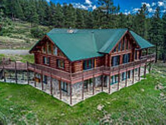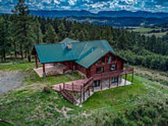 Exclusive Navajo River Ranch gated community features this Beautiful 4058 square foot CUSTOM Swedish-cope log home with amazing views of Navajo Peak and the valley, it sits on 35.5 acres so Horses, a few cattle and chickens are welcome. The exterior entry is covered. As you enter the home you will see the open floor plan living room with a huge wall of windows and sliding doors out to the wrap around deck that brings nature inside. The Dining room features windows to bring in lots of light and door out to covered deck where you will find the outdoor BBQ grill etc... The kitchen features custom cabinetry with pull out shelving for easy access to your groceries and kitchen wares, ample counter space for the chefs in the family. primary en-suite in on the main level with door out to the wrap around deck as well. Also features a large mud room and full bath. Down stairs features full bar area, 4 bedrooms each with their own sink, vanity/desk area, they also have doors from each room out to the lower patio to enjoy their morning joe or evening sunsets. Upstairs is a loft for extra guests, office etc.. The shop has plenty of room for a few vehicles ATVs, work shop area etc...