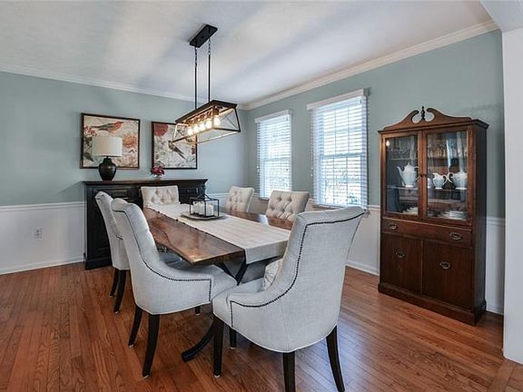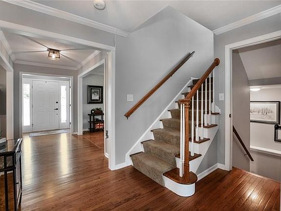 Beautiful hardwood floors on entire main level! New roof & new hardi-plank in 2019. Level front yard leads to well-maintained home. Entry has two coat closets. Crown molding in foyer, living room & dining room. Dining room has chair rail & newer chandelier. Lots of light in family room with crown molding, bay window, ceiling fan & gas fireplace between family room & kitchen. Kitchen has large island with seating & extra storage, stainless appliances & pantry closet. Separate breakfast area (10x9) walks out to deck. Master bedroom has vaulted ceiling w/fan, walk-in closet & views of golf course! Master bath with dual sinks, jetted tub & new shower. Three upper level guest bedrooms have plenty of closet space & share hall bath with dual sinks, tub/shower combo & linen closet. Attic storage with pull down stairs. Finished walkout lower level. Closet under stairs for extra storage. Newer A/C. Covered deck. Trex is around windows. Two-gar garage with additional storage space.