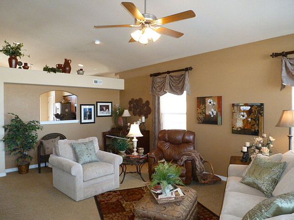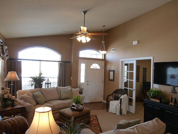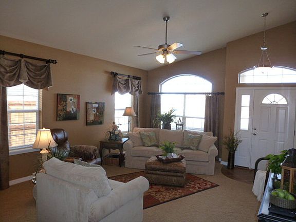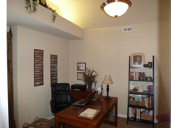 The WOW factor! This beautifully appointed and decorated home is both attractive and functional. Energy-efficient 2x6 construction coupled with low-maintenance stucco siding and concrete tile roof mean easy, comfortable, low-cost living awaits you. Large den/office features volume ceiling with dramatic up-lighting. The spacious kitchen with center island adjoins the cozy sitting/TV area. The entry courtyard is both inviting and attractive. The back yard features a covered patio and is fully landscaped and fenced. Note the upgraded maple cabinets with soft-close drawers and roll-out shelves, accent crown molding, glass-tile accented back-splash, as well as the stamped, dyed concrete patio. Compare it to all of the rest. This one shines!