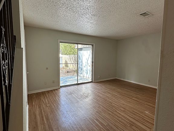The apartment has laminate wood floors and a cute kitchen. There is a loft-style bedroom and a full bath upstairs, with the living area and half bath downstairs. Walk-in closets and great extra storage too! Washer and dryer connections are available in the utility closet on the patio. More pictures coming soon.