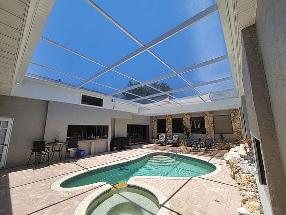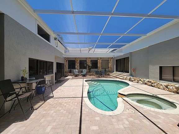 Priced to sell! If you are looking for privacy, this updated, courtyard Pool home is for you. This house features 2,617 square feet with 3 large bedrooms, 3 full bathrooms, a 2 car oversized garage and separate drive through carport. It is very unique with lots of rock walls and rock accents. This ready to move in house has been well cared for and has been newly painted both inside and out. The home was renovated with a new permitted roof in 2021, and the 2 air conditioning units are fairly new. When you open the front door, you have a beautiful view of the courtyard pool and lots of natural lighting. All of the rooms open up to the courtyard pool area, which is perfect for entertaining. The large kitchen with a Viking gas stove is the center of the house, and it opens to a roomy living room and dining room. All of the rooms have high vaulted ceilings, and many have skylights for beautiful natural light throughout. The two hallway bedrooms have high ceilings and new fans. The large guest bathroom has a linen closet and a beautifully tiled walk in shower with seat. The pool bathroom is nicely updated and is conveniently located right off of the courtyard pool. The laundry area is located inside in the hallway closet. On the other side of the house, the master bedroom has a large walk in closet and a separate accessory closet. There is plenty of room for a small living area or home office as well as room for a king sized bed. The master bathroom has a Jacuzzi tub, double sinks, a large open shower and separate toilet room. Since it is a corner lot the yard maintenance is extremely low. This is a Must see! Low HOA fees and no CDD’s. Great location off of SR 70, east of 301 with easy access to just about everything, beaches, restaurants and shopping. Excellent school district. Contact the owner today to schedule a showing! Allison Flagg Cell phone, call or text 941-320-9528 allyflagg4@gmail.com