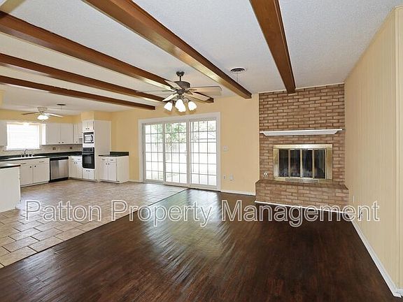 Cute 4 bedroom 2 bathroom house with sleek hard wood looking tile floors, a fireplace, and a spacious kitchen.