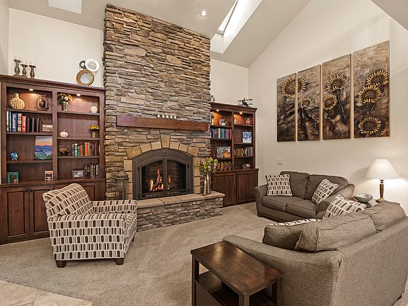 This stunning, meticulously maintained custom home in the highly desirable neighborhood of Ponderosa Trails checks all the boxes. As you enter this move-in ready, highly upgraded home you'll love the soaring ceilings and natural light from the skylights. The kitchen boasts stained knotty pine cabinets, rough edge granite, high end stainless steel appliances, double oven and a pantry with pull out shelving. The focal point in the living room is the stunning rock surround and beautiful built-in cabinetry encasing the remote start gas fireplace. The primary bedroom is on the main floor and also has a gas remote start fireplace. Enjoy the travertine upgrades in the luxurious primary bathroom. Upstairs you'll find two bedrooms and an additional oversized bonus/bedroom.
