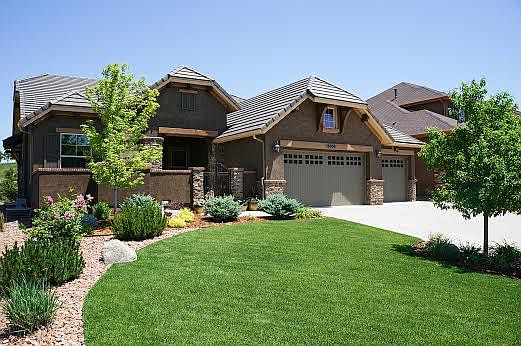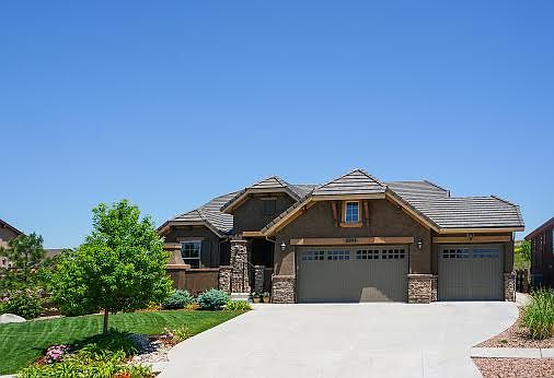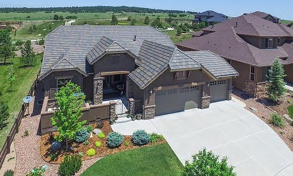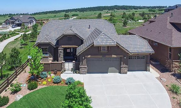 Saddletree Custom Rancher with the quality you expect!! All hardwood main level with inlaid tile entry. Designer touches throughout from paint to the custom colonist trim package with 4" trim. Great room concept featuring stone fireplace and entertainment center flowing into huge eat in kitchen with granite counters and tile backsplash. Main level master suite with tile floors and raised granite counters. Full finished basement with Rec Room, Media Room and 3 big bedrooms. Enjoy the custom rear and front patios with no side or rear neighbors and views of Pikes Peak. Central A/C, 4 car tandem garage, custom blinds, 3 gas fireplaces, stucco exterior, tile roof and tons of custom upgrades. All the finishes you would expect in a Saddletree Home!!