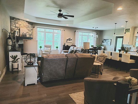 Almost NEW 2yr old stunning ranch. Numerous high end features. Open concept kitchen/LR. Kitchen w/white cabinets, white granite island, stainless JennAire appl w/gas range, microwave/convection oven, walk-in pantry & more. LR w/beautiful stone gas fireplace & wood plank floors. Master suite features tiled walk-in shower, walk-in closet & attached laundry room w/dual entry. Completely finished LL w/entertainment area w/bar & refrigerator, large FR space, 2 BRs & full BA w/walk-in tile shower! Custom landscaped yard, brick pavers patio, fire pit, patio w/custom Roll Curtains. HURRY!