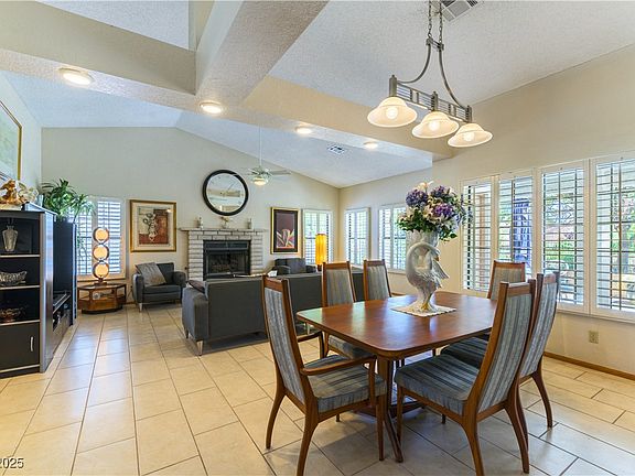 Las Vegas' best-kept secret! Located in a guard-gated community offering resort-style amenities including clubhouse, golf, pools, tennis, and pickleball. This light-filled 2-bedroom, 2-bath home features ceiling fans throughout, plantation shutters, and a cozy gas fireplace in the living/dining room. The eat-in kitchen is perfect for everyday dining. The spacious primary bedroom includes a versatile area ideal for a sitting room or office. The primary bath offers double sinks and a walk-in shower. Mirrored closet doors add a stylish touch. The 2-car garage includes a refrigerator. Recent upgrades: AC/heater (1 year old) and water heater (2 years old). A must-see!