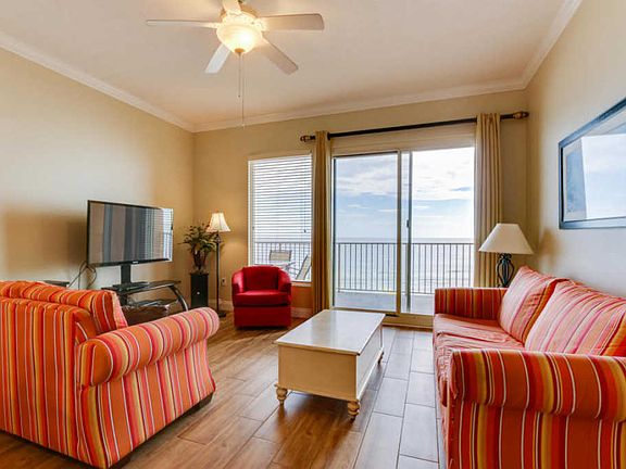 If you are looking for a one of a kind property and a terrific investment look no further! This highly sought After, 2 Bed/2 Bath condo on the 3RD floor of Treasure Island and has one of the BEST VIEWS on Panama City Beach! Enjoy sunrise views in the morning and Sunset views in the evening! The layout of this over-sized condo's interior is superb for entertaining, offering 10' ceilings through-out and an excess of space and features!! THIS UNIT IS ON THE 3RD FLOOR OF THE DEVELOPMENT, THE SAME FLOOR AS THE PARKING GARAGE ACCESS, SO NO ELEVATOR IS NECESSARY! Simply park on the garage's 3rd level and walk over the sky bridge to the unit. The pet friendly complex has a large heated pool and a kiddy pool and two gazebos, covered parking, four high-speed elevators, fitness room, owner's