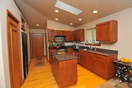 Former model with Frank Lloyd Wright Prairie style design exterior & Custom Prairie style interior finishes. This is truly a lifestyle home w/a first floor master suite, soaking tub, shower & private deck. Gourmet kitchen includes stainless steel appliances, granite countertops, hardwood floor, custom birch cabinets & skylights. Family room with tile floor, wet bar, stone gas fireplace & built in surround sound entertainment center. Other features include intercom, quality casement windows